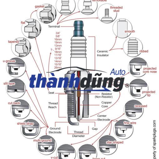 Bugi xe ô tô có cấu tạo gồm 2 bộ phận chính: Điện cực trung tâm và điện cực tiếp đất; Vỏ cách điện. Điện cực trung tâm và đầu điện cực là nơi tạo ra tia lửa điện, có thiết kế hình vuông và nhô ra trên bugi. Bên trong điện cực trung tâm có chứa điện trở kết nối với đầu ta của cuộn dây đánh lửa hoặc từ trường bằng một dây cách điện dày. Bộ phận này thường được làm bằng các loại hợp kim như Nikel, Platinum hoặc Iridium. Vỏ cách điện của bugi luôn được thiết kế bằng gốm oxit có độ bền cao, chịu nhiệt và truyền nhiệt tốt để đảm bảo cho bigu không bị rò rỉ điện áp cao. Ngoài ra, trên bề mặt vỏ cách điện, ở vị trí đầu tiếp xúc với chụp bugi, thường được thiết kế có dạng những nếp nhăn thành hình lượn sóng có tác dụng ngăn ngừa hiện tượng phóng điện cao áp – để làm giảm nghiêm trọng hiệu quả đánh lửa trong buồng đốt.