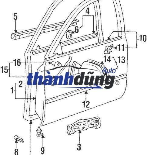 - Khung cửa: Được làm từ thép cường lực, tạo khung đỡ cho toàn bộ cánh cửa. Khung cửa có vai trò quan trọng trong việc bảo vệ người lái và hành khách trong trường hợp va chạm.