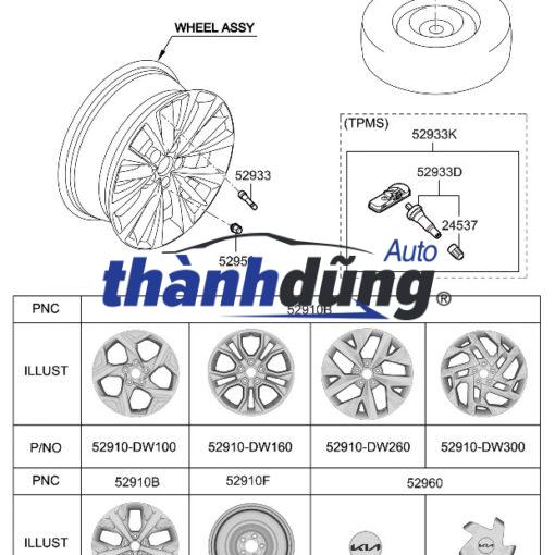 La zăng đúc Wheel Assy-Aluminium được lắp đặt tại bốn bánh xe của xe ô tô. La zăng đúc được lắp đặt tại trục bánh trước của xe. La zăng đúc Wheel Assy-Aluminium được lắp đặt tại trục bánh sau của xe. Mâm đúc được cấu tạo từ các bộ phận chính sau: