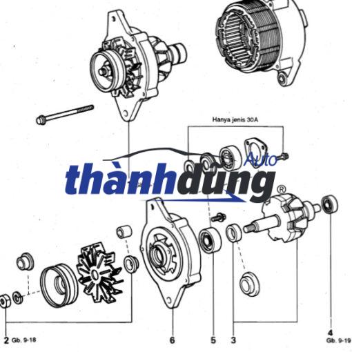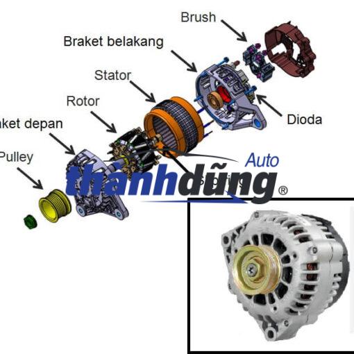 Máy phát điện ô tô chuyển đổi cơ năng thành điện năng, trong đó nguồn cơ năng có thể là động cơ đốt trong, tua bin nước, tua bin gió,… Thiết bị này thường được gắn ở gần động cơ xe và được dẫn động bởi trục khuỷu. Máy phát điện ô tô là một bộ phận quan trọng không thể thiếu trong mỗi chiếc xe ô tô. Việc hiểu rõ về cấu tạo sẽ giúp ích trong quá trình kiểm tra, khắc phục sự cố, hư hại xe. Cấu tạo máy phát điện trên ô tô bao gồm các bộ phận cơ bản như sau: Rotor là một nam châm quay bên trong cuộn dây stato, sinh ra từ trường biến thiên để tạo ra lực điện trường trong cuộn dây. Cuộn dây được quấn xung quanh 6 cặp lõi cực (12 cực từ) và lực điện được sinh ra từ khi có dòng điện chạy bên trong. Vì cường độ dòng điện chạy vào roto tăng dần nên đồng thời cũng sinh ra nhiệt. Tùy vào mỗi loại máy phát điện mà chúng có thể trang bị thêm quạt đồng trục với roto hoặc chỉ cần thiết kế vỏ bên ngoài tản nhiệt tốt. Stato tạo ra dòng điện xoay chiều 3 pha trong máy phát điện ô tô nhờ vào sự thay đổi từ thông bởi roto quay. Stato gồm có lõi và cuộn dây được đặt trong khung phía trước. Vì stato tạo ra nhiệt nhiều hơn bất kỳ bộ phận nào khác trong máy phát điện xoay chiều. Vì thế người ta thường sử dụng vỏ cách nhiệt để bảo vệ các cuộn dây. Diot giúp chuyển đổi dòng điện xoay chiều thành một chiều, cho phép dòng điện đi theo một hướng từ máy phát điện sang pin. Quạt làm mát nằm bên trong hoặc bên ngoài máy phát điện nhằm đảm bảo sự an toàn cho các bộ phận. Quạt giúp tản nhiệt, ngăn chặn sự nóng lên quá mức dẫn đến hư hỏng hoặc cháy nổ. Chổi than được làm từ graphit kim loại được sử dụng để giảm điện trở và điện trở tiếp xúc và đồng thời chống sự ăn mòn. Bộ nắn dòng thực hiện chức năng chỉnh lưu đầy đủ toàn bộ chu kỳ. Để chuyển toàn bộ dòng điện xoay chiều 3 pha được tạo ra từ các cuộn dây stato thành dòng điện một chiều nhờ 6 diot hoặc 8 diot với các diot ở điểm trung tính. Bộ phận này trong máy phát điện giúp ô tô điều chỉnh điện áp sao cho ổn định, hạn chế ảnh hưởng của sự gia tăng đột ngột của dòng điện.